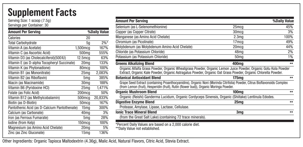 The Greens Alkalizing Blend is comprised of all organic ingredients including Wheatgrass, Kale and Chlorella. The Botanical Antioxidant Blend gives an added boost of antioxidants from Organic Noni, Grape Seed Extract and Moringa. The Organic Mushroom Blend features potent mushrooms like Reishi, Shiitake and Cordyceps. The last two include the Digestive Enzyme Blend to support digestion and the Ionic Trace Mineral Blend, which features 72 trace minerals derived from the Great Salt Lake. All of this is available in two delicious-tasting powders: Fresh Berry or Crisp Apple.