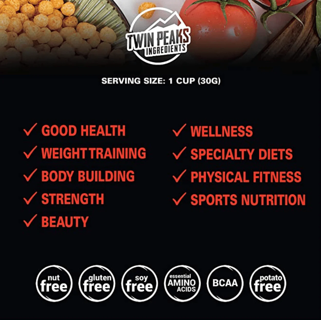 Compare a bag of chips to Twin Peaks Ingredients Protein Puffs. Game Over! Twin Peaks Ingredients Protein Puffs make a great protein replacement. It's easy, requires no thinking, no work, tastes super delicious, and one cup delivers 21g of high quality protein with 4.2g BCAAs and 4.5g Glutamic Acid to promote healthy muscle development.